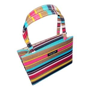 This colorful Kate Spade mini bag is a perfect addition to any wardrobe. With a striped pattern and multicolor handle/strap, this bag is sure to make a statement. Measuring 8 inches in width, 6 inches in height, and 4 inches in depth, it's the perfect size for a night out. The zip closure ensures that your belongings will stay secure. This bag is new without tags, making it a great addition to your collection.