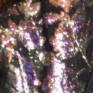 Cropped. Needs button sewn back on. Lightweight, Breathable. Tailored in back so no boxy look. Black lining inside. Hard to catch the colors but they change in different types of lighting. Def Rocker Style Jacket! Steven Tyler would LOVE this! LOL.
