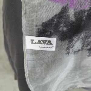 I have had this scarf for several years. It was great for warmer months if air conditioning was too much or for traveling on a plane. No matter how you use it, I found it to be very versatile. The colors make me think spring, but the touches of black make it a year round favorite. I am purging because my closet is bulging, and I need the space. It is 100% polyester. No flaws. The dimension is 73" x 36".