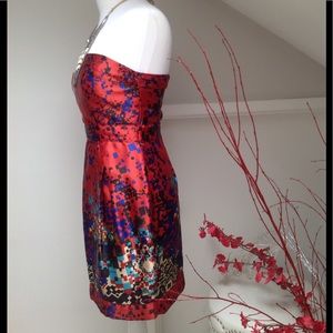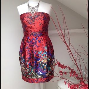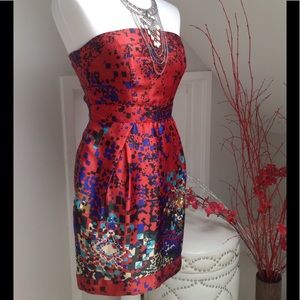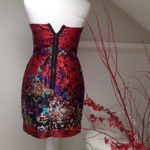 ✨Multi Color Matrix Strapless Mini Dress in great condition. No flaws at all. Satin like material with multi color matrix squares throughout. Front and back skirt darts, exposed back zipper closure, and fully lined. Size XS (nothing wrong with zipper, my mannequin is a S/M). 100% polyester. Measurements are 16" bust, 14" waist, and 27" from top to bottom hem.✨{20}