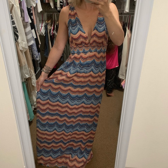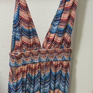Low cut multi colored maxi dress. I cut it to be a little shorter so the bottom is a little frayed but it still looks good