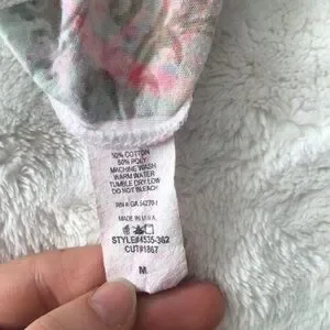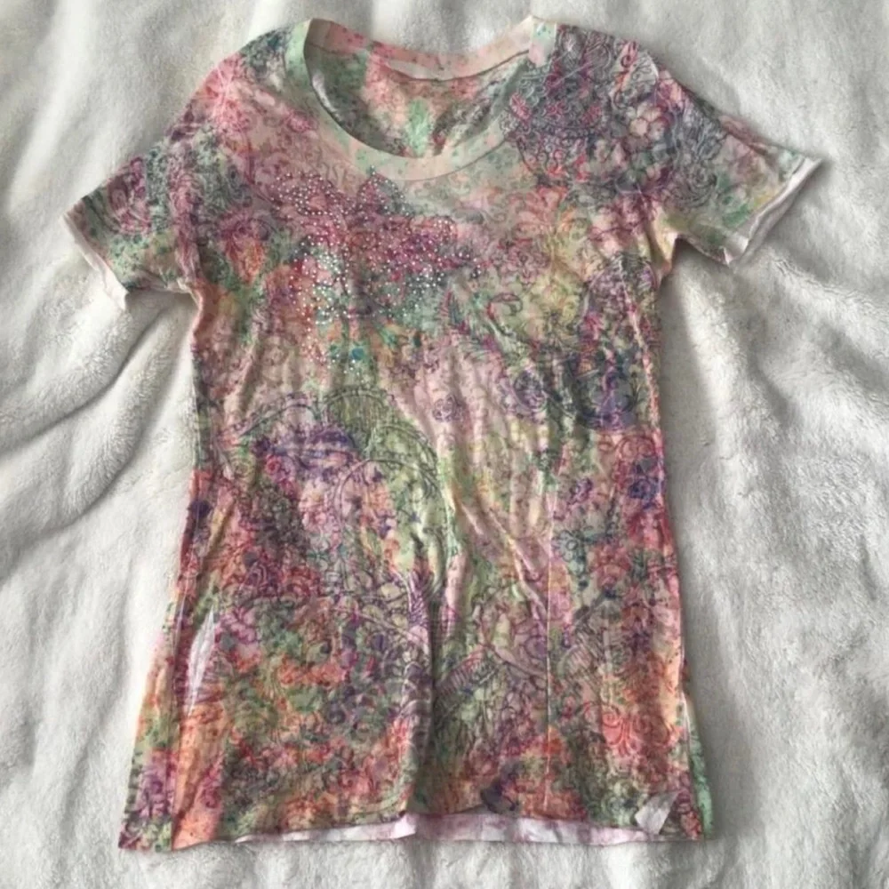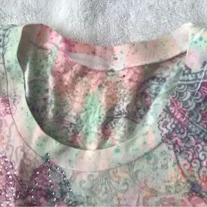 Colorful bedazzled top, not for sure on what brand it is but I think it’s G Girl. Very soft, only flaws I know of are that I undid the stitching on the sleeves so it has the white part on the edges to make it more stretchy and comfortable. I’m a small/medium and it’s true to size, the material is also pretty thin but not too see through
