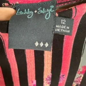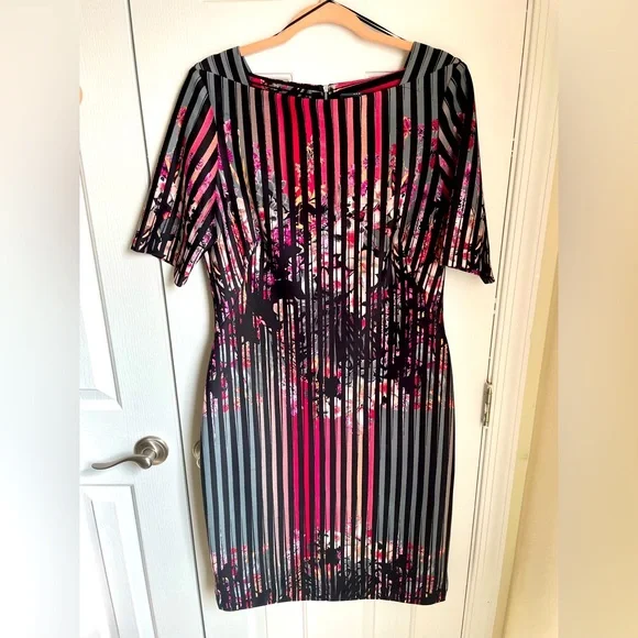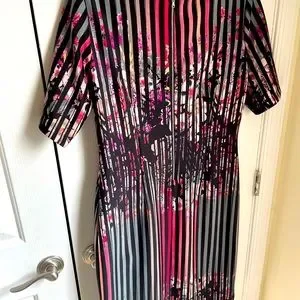 Comfortable black and pink floral dress. Cap sleeve, mid length. Has some stretch and hugs the waist just right.