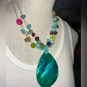 Get ready to turn heads with this gorgeous green blue multi stone necklace! This preloved beauty is in great condition and ready to add a pop of colour to any outfit. The combination of green and blue stones gives it a unique and eye-catching look that is sure to make a statement. Whether you're dressing up for a night out or just want to add some flair to your everyday look, this necklace is the perfect choice. Don't miss out on the chance to own this one-of-a-kind piece!