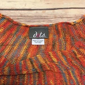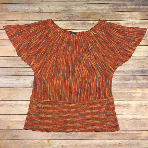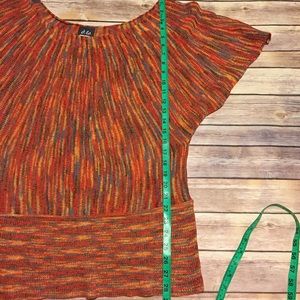 This multi-colored short sleeve top has a fitted hem. Approximate measurements are shown. Worn once, in excellent condition.