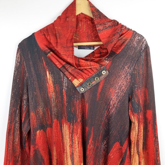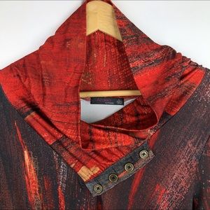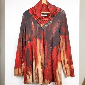 Multi color tunic. Long sleeves. High neck with faux button detail. Very soft! And stretchy. 95% Polyester / 5% Spandex.
