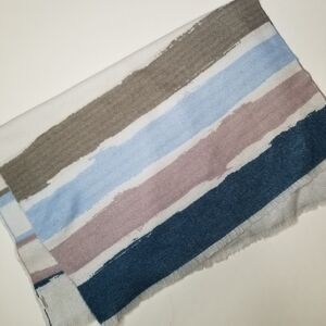 Unbranded, EUC warm and soft scarf. White body with teal, mauve, light blue and gray color stripes. Fun fringe ends.