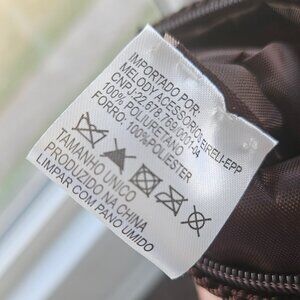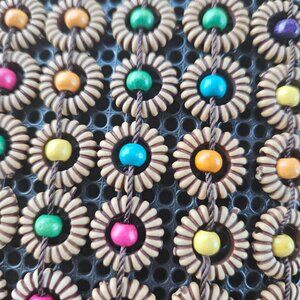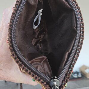This is a cute cross body bag made with a plastic base and hand beaded with multicolor wood beads. Strap has the same beading with a macrame style knotting. Bottom has larger disks in the same colors. The interior is lined, tag on the inside says Melody Accessories. Zipper closure. Overall it's in very good condition and would make a nice addition to a casual wardrobe...