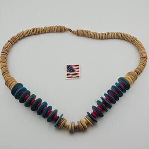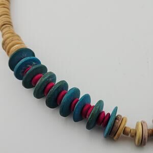 Multi Color Wood Disc Beaded Necklace Natural Bohemian Hippie Tan Teal Red
