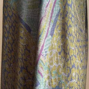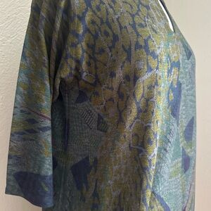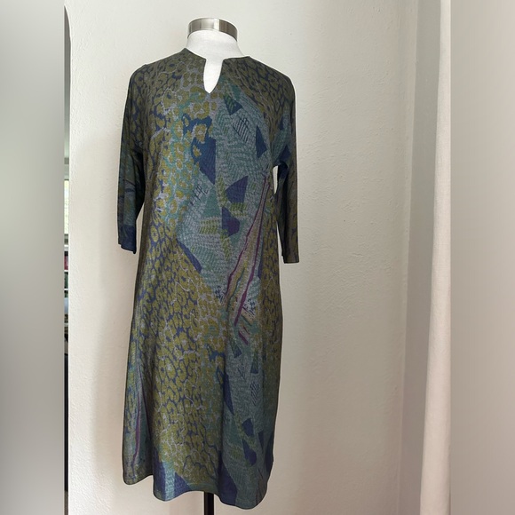 This artsy Monets Garden wool dress fits and hangs so nice. It’s a thin wool so you can easily add a wrap or jacket to it especially since there’s so many beautiful colors to work with. The sleeves are 3/4.