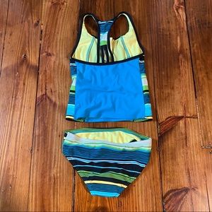 Only worn once! Girl’s racer back tankini with small strappy details on the back and a zipper in the front.