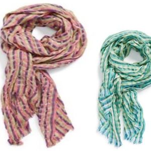 Multi colored textured basket weave scarf with fringe. 70 inches x 20 inches. 50% wool and 50% viscose. Comes in pink or turquoise.