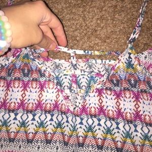 Multi Colored tank top, flowy. Size medium & is light weight but great material! Wore it 2 times.