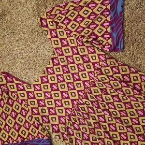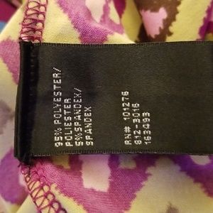 The top is an empire style with bell sleeves. It has pink, purple and green geometric patterns. The length is 28" from the shoulder to the hem. The neck is square in the front and back.