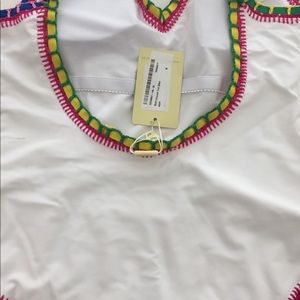 This is a white one piece bathing suit with multi-colored trim around the edges. The bathing suit has pads with an attached bra. The bathing suit has never been worn and the tag is still attached.