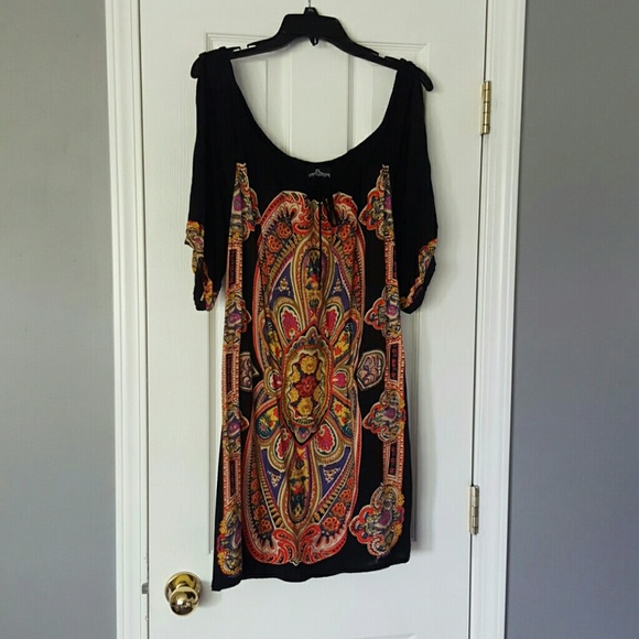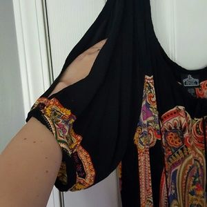 Gorgeous printed tunic. Slits in the sleeves (pictured) in new condition. Black with several colors. The bottom of the sleeves are cinched