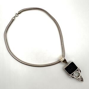 This estate piece consists of an epic handmade pendant set in sterling silver featuring blue goldstone, black pearl and three amethysts. Additionally a fabulous sterling silver snake chain choker by Fornster lends some drama to the overall look.