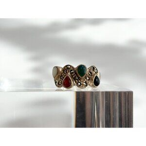 Lovely sterling silver vintage multi gemstone with stones that are in the shape of teardrops ring. There are turquoise, coral, mother of pearl and black onyx. Between the teardrop stones are marcasite stones which are bezel set. Straight band. Marked as sterling and tested positive as such via chemical testing. Very pretty and unusual ring.