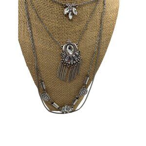 Multi Layer Silver Tone Necklace Clear Crystal Accents Lobster Clasp Adjustable