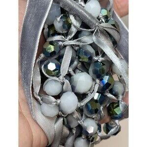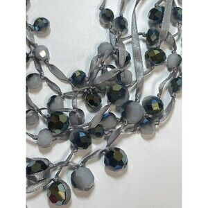 This beautiful statement necklace consist of seven layers of faceted beads in shades of metallic blues, gray, and silver. Beads hang on a silver satin ribbon and strung to a silver velvet ribbon. Came in a J. Crew box, but there is no markings stating that it is a jcrew piece. In Excellent preowned condition. Comes from a smoke-free home.