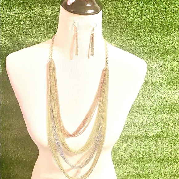 Layered necklace each layer with a different color (gold, silver and copper) with matching earrings.