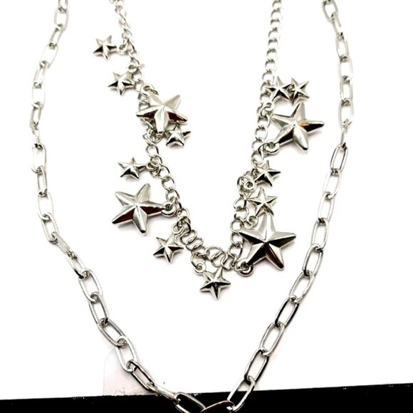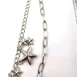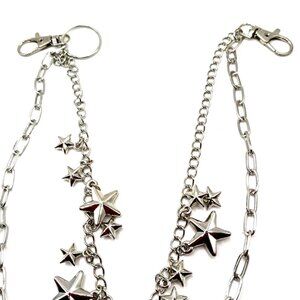 Used in excellent condition -no damage 18 inches double Layered wallet or pants chain with 14 metal stars of various sizes attached. Measures 18 inches long overall- the 1st chain measures 17 inches with a 2 inch drop to the 2nd chain.-second chain is 16 inches long Features secure lobster clasps in either end.