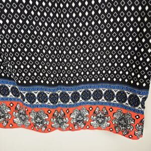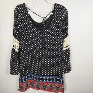 Multi Print Boho Peasant Tunic Crochet Sleeve Tie Back MED Paisley Geo Print