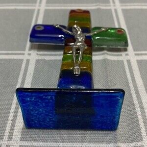 Multi Rainbow Color Art Glass Cross Silver Tone Jesus Crucifix Religious Gift