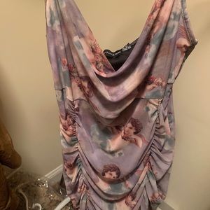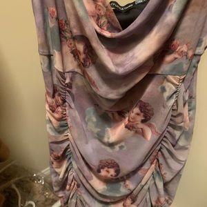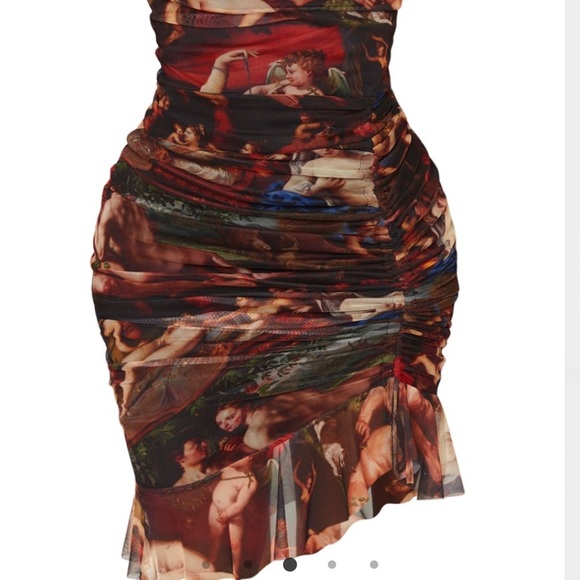 Featuring a multi renaissance print material with a ruched detailing and a figure-hugging fit. 95% Polyester 5% Elastane