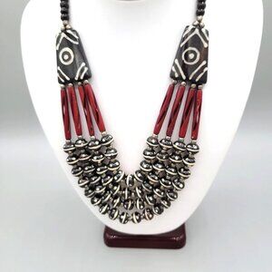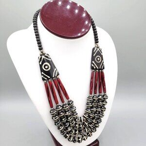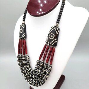 Multi Row Boho Tribal Necklace Black and White Stones Red Tube Beads Vintage