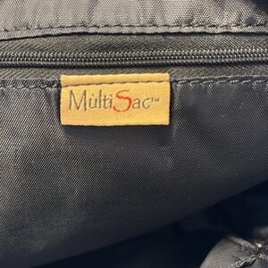 Multi Sac small black backpack. Two zippered pockets in front. Main compartment has zipper close with one internal zippered side pocket and one open side pocket. Adjustable straps. Measurements are 9” x 9”.