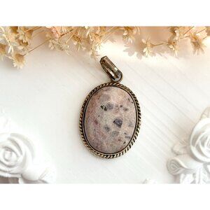 Fantastic jasper gemstone pendant. Bezel set and surrounded by rope accents. The stone has gorgeous shades of pink and peach. Bail is also sterling silver. Would look fantastic with a sterling silver chain.