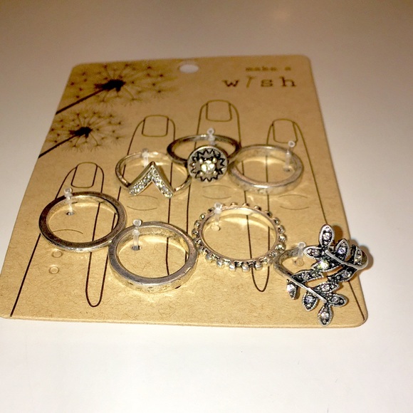7 silver color Rings some with rhinestones multi sizes to use as rings or midi rings.