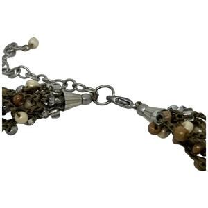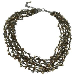 The necklace has a beautiful organic flow with approximately 6-8 strands creating a sophisticated layered effect. The combination of materials gives it a vintage-inspired, bohemian aesthetic while remaining lightweight and comfortable to wear.