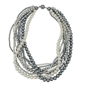 Multi Strand Beaded Faux Pearl Choker Necklace Gray White 16"