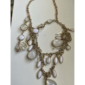Multi Strand Beaded Long Necklace Clear Acrylic White And Gold Tone 20-26 Inch