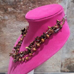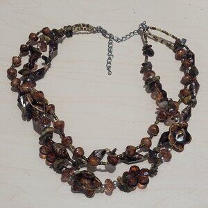 A multi-strand beaded necklace featuring a mix of brown, amber, and bronze-hued beads, some of which are freshwater pearls.