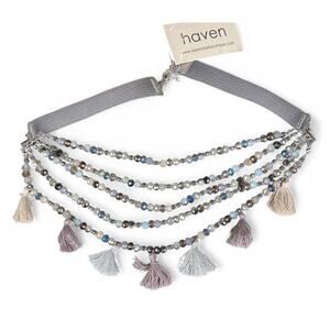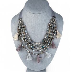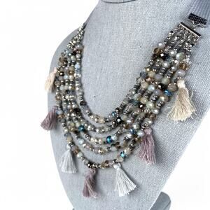Multi Strand Crystal Bead Necklace with Tassels Gray Taupe Statement Jewlery
