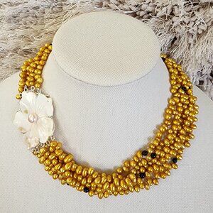 Elegant 6 strand golden freshwater pearl necklace choker with 925 sterling silver and mother of pearl clasp.