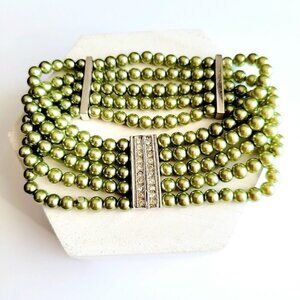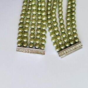 Multi Strand Glass Pearl Bracelet Rhinestone Slider Clasp Light Olive Green 7.5"