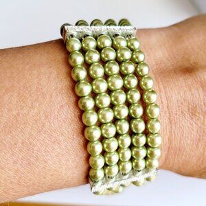 Multi Strand Glass Pearl Bracelet Rhinestone Slider Clasp Light Olive Green 7.5"5 rows of 4mm glass pearls