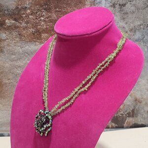 Beads: The necklace chain is made of multiple strands of small, green, irregularly shaped beads, possibly peridot stone chips.
