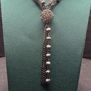 Multi Strand Grey Beaded Ball Tassel Necklace Titanium Silver Women 37in