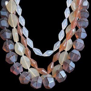 This multi-strand layered necklace features stunning faceted beads in soft earth tones of brown, cream, and translucent white, creating a timeless and elegant accessory. The smooth and faceted textures add dimension, while the adjustable chain ensures a perfect fit. This versatile piece complements both casual and formal outfits, making it perfect for weddings, evening events, or everyday wear. Its unique blend of natural tones and modern design ensures it will stand out in any jewelry collection.