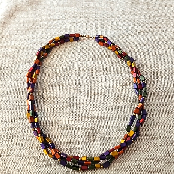 3 strand twisted multi colored necklace. Approx 20 inches long. Simple hook closure.