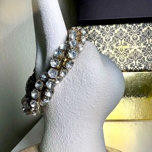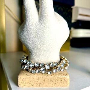 Elegant crystal bracelet with 3 intertwined straps. Features sparkling stones. Perfect for adding glamour and bling to any outfit.