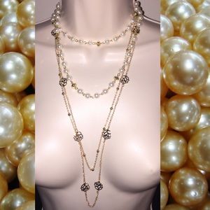 Multi Strand Rose Gold Lotus Flower Chain & Pearl 3 Row Waterfall Necklace
