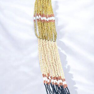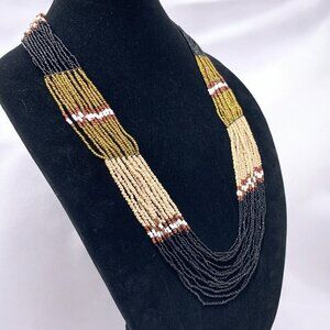A beautiful, boho tribal style seed bead necklace featuring multiple strands of earth tone beads in a color black design. Sections of gold, ivory, rust and slate grey beads with a pop of contrasting white, with gold tone metal end caps at the back of the neck with a spring ring clasp and short extender for an adjustable fit. Excellent preowned condition.