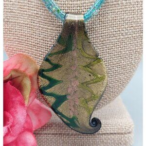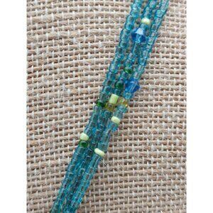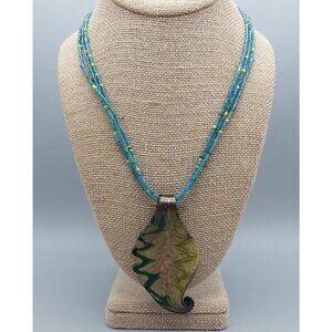 This necklace enchants with its multi-strand design and tiny blue glass seed beads, culminating in an art glass gold foil pendant. Exuding a beach boho vibe, it makes a stylish statement with any outfit.