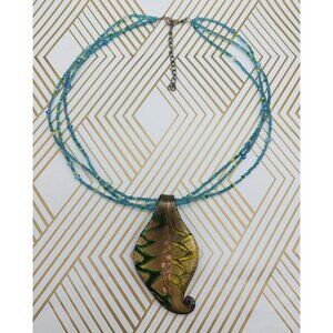 Multi Strand Tiny Blue Glass Seed Bead Necklace Art Glass Gold Foil Pendant 21"